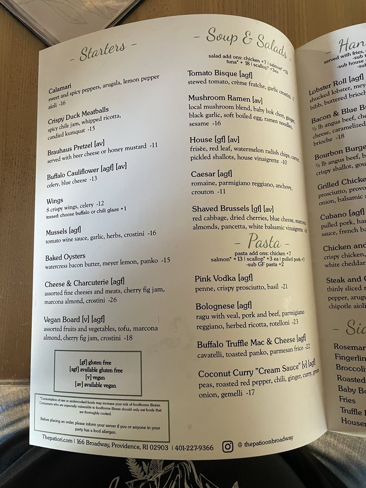 Introducing the menu at The Patio on Broadway in Providence offers a delightful range of brunch and lunch options. From the flavorful Bruschetta topped with whipped stracciatella to the mouthwatering Chicken & Waffle sandwich, each dish is expertly crafted. The Provy Cheesesteak stands out for its shaved ribeye and garlic aioli combination, while the Breakfast Burger with prime beef and fried egg is a must-try. Customers rave about the impeccable service and cozy atmosphere at this women-owned establishment. The innovative cocktail menu and extensive beer and wine selection add to the overall experience. Don't miss out on the vibrant ambiance and delicious food offerings at The Patio on Broadway in Providence.